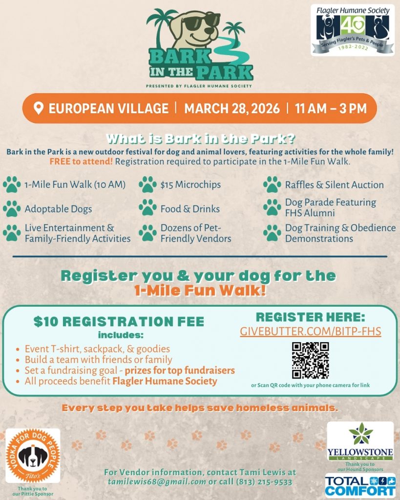 Every step you take at Bark in the Park directly supports Flagler Humane Society’s mission to save and improve the lives of animals through compassionate care, lifesaving programs, education, and advocacy.