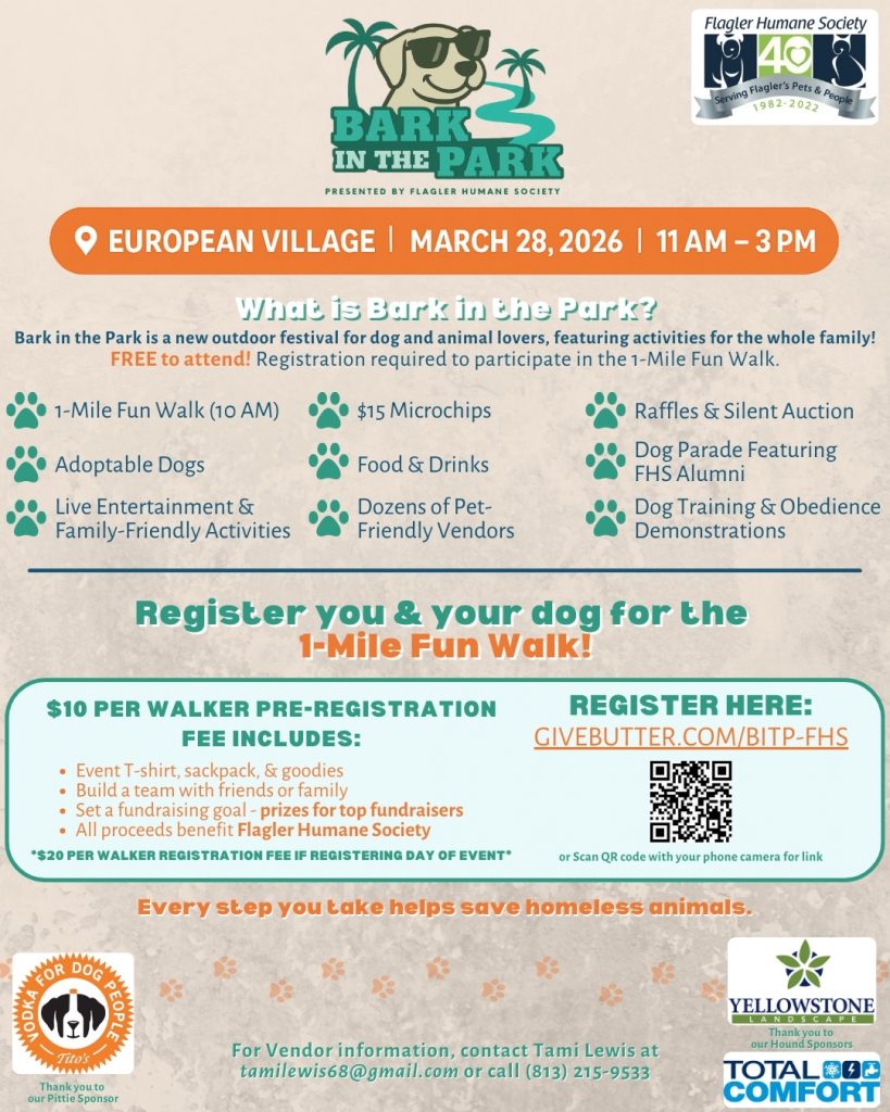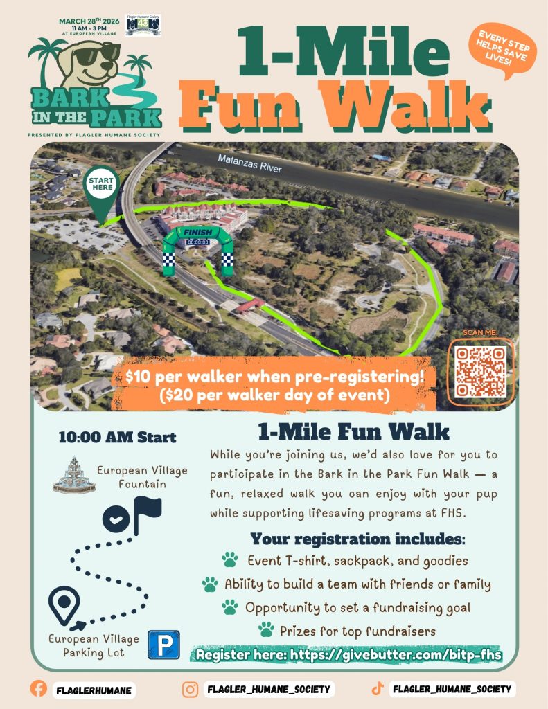 Every step you take at Bark in the Park directly supports Flagler Humane Societyβs mission to save and improve the lives of animals through compassionate care, lifesaving programs, education, and advocacy.