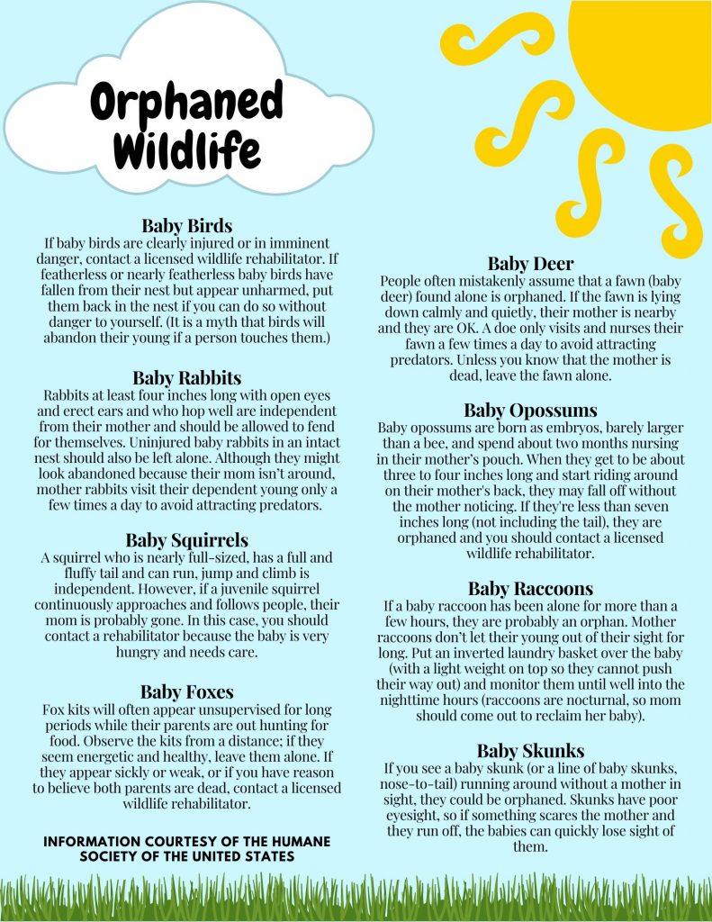 For more information, go to https://www.humanesociety.org/resources/found-orphaned-or-injured-baby-wild-animal